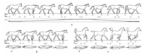 Nelle andature l’impulso al movimento si origina dagli arti posteriori. In particolare la forza parte nel garretto, il cui angolo articolare (tibio-tarsico) dopo essere stato chiuso al massimo si apre scattando a molla e premendo sullo zoccolo puntato contro il suolo; da qui la forza d’impulso si trasmette al tronco mediante il sacro e agli arti anteriori tramite la colonna vertebrale. A questo punto le masse muscolari pettorali, facendo perno sugli arti anteriori e contraendosi, trascinano il corpo in avanti e spostano nella stessa direzione il centro di gravità in modo che l’animale, trovandosi in una posizione di instabilità, avanza con un piede dopo l’altro per crearsi una nuova base d’appoggio e per seguire gli spostamenti del suo centro di gravità.